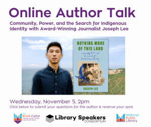 Community, Power, and the Search for Indigenous Identity with Award-Winning Journalist Joseph Lee Wednesday, November 5, 2pm Register online & submit your questions for the author. You’re invited to learn… |
